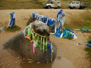 Trzeciego września o ósmej rano już siedzimy w marszrutce do Barguzina. Jeszcze tylko trzysta pięćdziesiąt kilometrów po wertepach, których w Polsce nie uświadczysz, wymiana koła, przekąska w przydrożnym barze (menu jadalne i bajecznie tanie) i wysiadamy w Gościnnym Domu Witalija – naszego przewodnika, kucharza, bajarza, zielarza i w ogóle – dobrej duszy na odludziu. Bania, kolacja, nocleg w domu podobnym do naszej agroturystyki, ale na bardzo porządnym poziomie i o ósmej rano 04. 09. wsiadamy do dwóch UAZ-ów, z których jeden jest półciężarówką pełną jakichś urządzeń, prowiantu, plandek, materaców i innych rzeczy o przeznaczeniu trudno przewidywalnym. Jedziemy kolejnymi wertepami przez Dolinę Barguzińską jakieś 90 – 100 km. Po drodze dodatkowe zaprowiantowanie w wódkę marki Wirgin – buriacką z certyfikatem i gwarancją Witalija o jej nieprawdopodobnie leczniczych walorach w odróżnieniu od ruskiego dziadostwa. Po drodze setki, a może i tysiące rzeczek, bagien, łąk, jeziorek słodkich, ale i słonych. Mijamy wioski buriackie i tatarskie. Dolina to niesamowite dno dawnego jeziora pomiędzy pasmami górskimi oddalonymi od siebie o kilkadziesiąt kilometrów, długie na ponad sto km. Jezioro popłynęło do Bajkału, gdy pękł górotwór pomiędzy nimi. Tak powstał przełom rzeki Barguzin. Zatrzymujemy się wyłącznie z przyczyn kultowych: Sanktuarium siedzącego byka, Kapliczka na przełęczy za Doliną