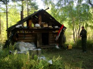 Za Doliną rozpoczyna się tajga. Jedziemy z reguły dnem strumienia lub jakimiś ostępami, po których w Polsce żaden przewodnik nie poprowadziłby nawet przełaju rowerowego. Po wjechaniu na tereny bagienne przez kilka godzin zajmujemy się głównie wyciąganiem z torfowiska samochodów, tkwiących w nim po osie. Metody są różne: na wagę, zrobioną z pnia modrzewia, przez podkładanie klocków, wałków i gałęzi – właśnie najlepsze są modrzewiowe, liną holowniczą długą na 20 m, albo wycinając drogę równoległą (pod piły poszło kilka hektarów tajgi. Pod wieczór jesteśmy na miejscu. Nasz apartament robi wrażenie raczej szokujące: szałas solidny, ale niesłychanie przaśny, chyba chodzi głównie o to, żeby nas niedźwiedzie w nocy nie skonsumowały ?