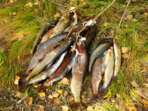 I zaczęło się wędkarstwo. Śniadanie, ubiór, sprzęt i w drogę. Ale kamienie ! – nie przypuszczałem, że przez kilka dni będę maszerował prawie wyłącznie z jednego otoczaka na drugi. I ten nurt ! Nie ma mowy o wchodzeniu we fragmenty dalsze od brzegu. I katowanie wody – na razie trochę na ślepo – aby zbadać co, na co, w jakich miejscach, jaką techniką. Itp., itd. Już wiem, że moje wodery są za małe jak na potrzebę całodziennego chodzenia, że podbierak na ryby nie ma sensu, bo tylko plącze się w najmniej użyteczny sposób, a podbieranie ręką jest bezkonkurencyjne. Ale nie wiemy gdzie są te niesłychane ryby ? Takie fantastyczne miejsca i nic, kompletna posucha. W końcu znajdujemy jakąś płań po przelewie i wybieramy z niej kilka sztuk. Dopiero po trzech dniach odkrywamy w górze rzeki olbrzymie eldorado, działające na zasadzie: rzut = branie. A zatem nie jest prawdą opinia, ze w syberyjskich rzekach wystarczy wsadzić rękę do wody, żeby ryba chwyciła za palec. Jak się już jednak człowiek rozpatrzył – co i jak – radości jest bez liku: