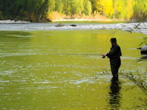 Generalnie poszliśmy w dwu kierunkach – spinning z obrotówką nr 3 z dużą ilością złotego i możliwie szerokim skrzydełkiem i muchówka ze sporym mudlerem koniecznie z jakimiś fragmentami w czerwieni. Inne przynęty, a nasłuchaliśmy się rozmaitych sensacji zarówno w Polsce, jak i tu na miejscu od naszych przewodników, zupełnie nie zainteresowały ani lenoków, ani hariusów. Hariusy szły głównie na mudlera, lenoki gustowały przeważnie w obrotówkach, chociaż złowiłem kilka na muchę. Głównym problemem spinningistów były oczywiście zaczepy i mnóstwo strat na kamieniach. Mucha sprawdzała się tylko w sytuacji, gdy udało się ją podać w środek nurtu, co nie było łatwe z uwagi na szeroki ciąg wody. Dużo lepiej było po podaniu muchy spinningiem z kulą wodną. Próby dotarcia do dobrych miejsc do obsłużenia muchówką kończyły się walką o życie z nurtem i gigantycznymi głazami pod nogami. Generalnie jednak lenoki dochodzące do 60 cm i Hariusy w okolicach 35 cm robią wrażenie, że hej!